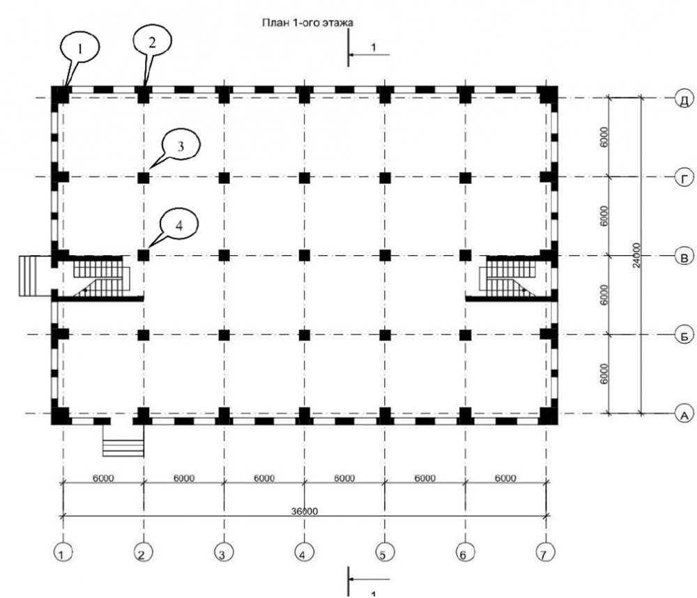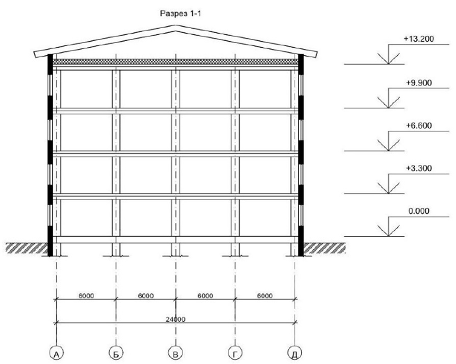 Габаритный план здания и схемы поперечного разреза показаны на рис. 1 и рис. 2.