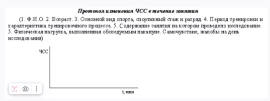 (1. Ф.И.О. 2. Возраст 3. Основной вид спорта, спортивный стаж и разряд 4. Период тренировки и характеристика тренировочного процесса 5. Содержание занятия на котором проведено исследование. 5. Физическая нагрузка, выполненная обследуемым накануне. Самочувствие, жалобы на день исследования)