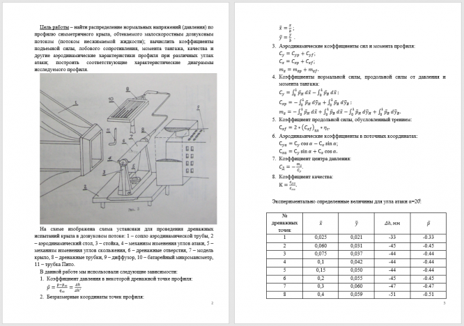 Цель работы – найти распределение нормальных напряжений (давления) по профилю симметричного крыла, обтекаемого малоскоростным дозвуковым потоком (потоком несжимаемой жидкости); вычислить коэффициенты подъемной силы, лобового сопротивления, момента тангажа, качества и другие аэродинамические характеристики профиля при различных углах атаки; построить соответствующие характеристические диаграммы исследуемого профиля.