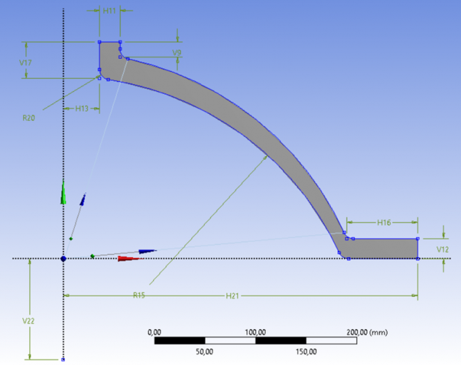 H11 = 20мм; H13= 36мм; H21 = 350мм; V12 = 20мм; V17 = 36мм; V22 = 100мм; R15 = 300мм. Радиусы скругления: R20 = 10 мм.