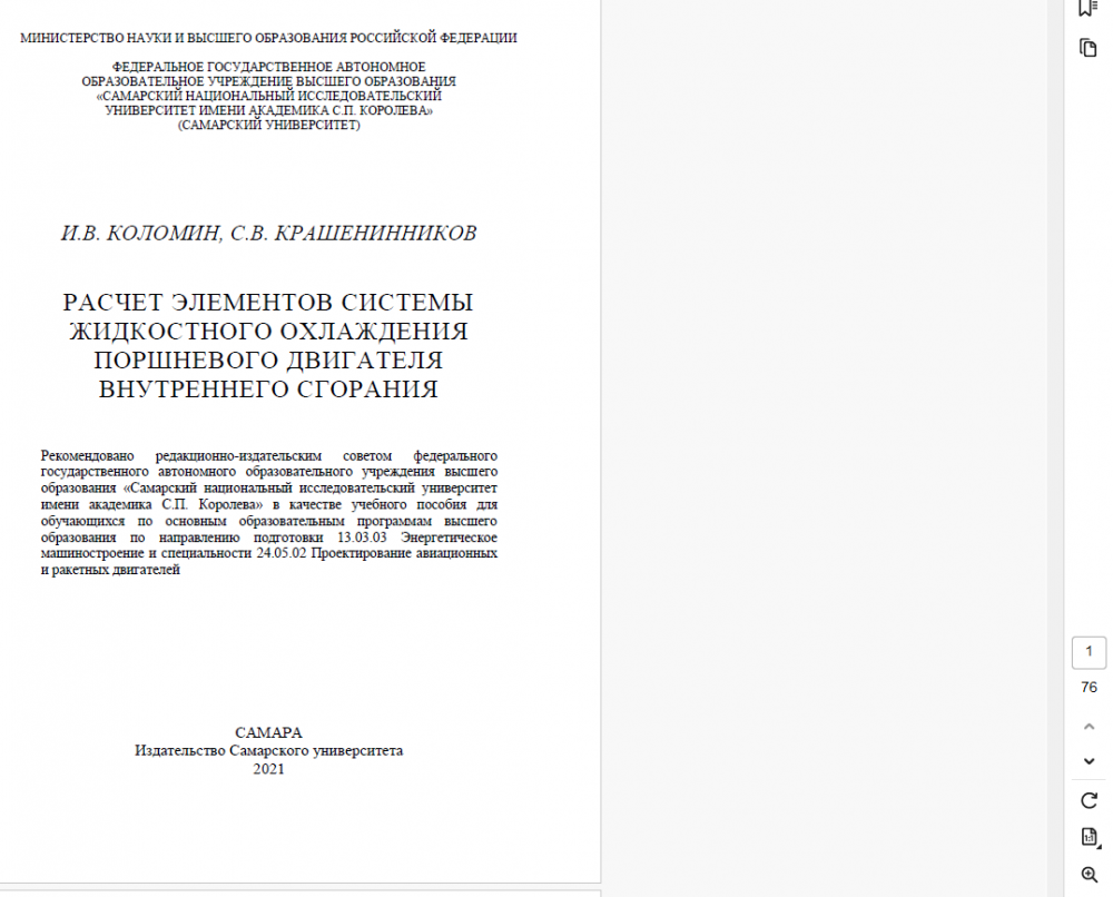 К612 Расчет элементов системы жидкостного охлаждения поршневого двигателя внутреннего сгорания: учебное пособие / И.В. Коломин, С.В. Крашенинников. – Самара: Издательство Самарского университета, 2021. – 76 с.