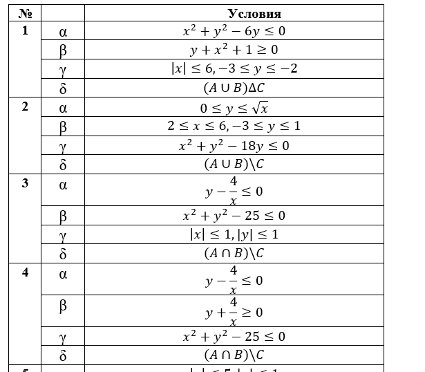 Пусть A, B, C – множество точек плоскости, координаты которых удовлетворяют условиям α, β и γ соответственно. Изобразите в системе координат XOY множество D, полученное из множеств A, B и C по формуле δ.