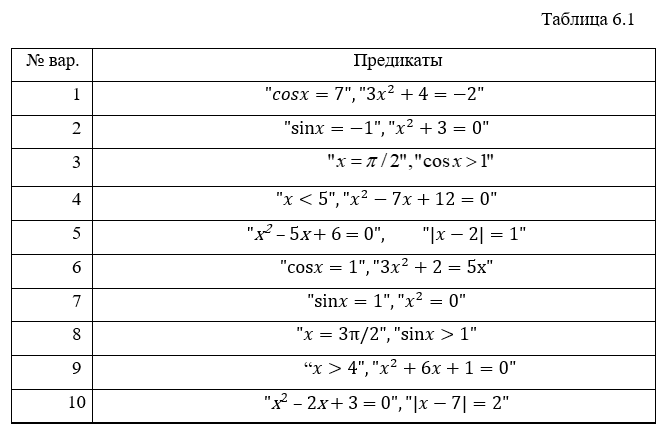 Для предикатов из табл. 6.1, заданных на R, выяснить, является ли первый предикат следствием второго, а второй – следствием первого.