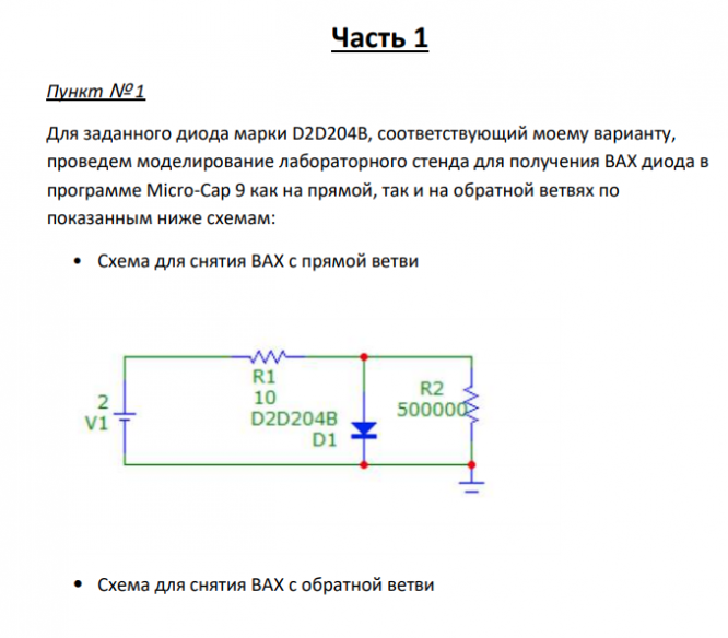 Пункт № 1 Для заданного диода марки D2D204B, соответствующий моему варианту, проведем моделирование лабораторного стенда для получения ВАХ диода в программе Micro-Сap 9 как на прямой, так и на обратной ветвях по показанным ниже схемам: