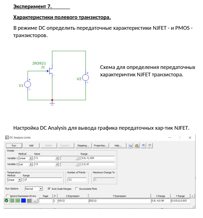 Эксперимент 7. Характеристики полевого транзистора. В режиме DC определить передаточные характеристики NJFET - и PMOS - транзисторов