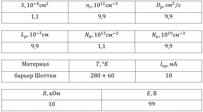 Вычислить напряжение на переходе при прямом включении при заданной температуре и заданном токе. Выяснить влияние температуры на прямое напряжение, увеличив температуру на указанное число градусов. Таблица 1. Исходные данные.