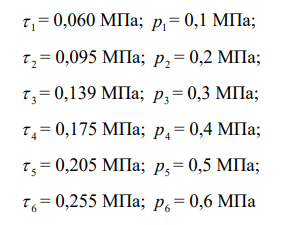 По результатам лабораторных испытаний грунта на прочность на сдвиговом приборе построить график зависимости предельных касательных напряжений от нормального (сжимающего напряжения) (график сопротивления сдвигу) и определить основные параметры прочности грунта.