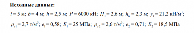 Рассчитать методом послойного суммирования осадку прямоугольного фундамента под колонну промышленного здания. Основание двухслойное: слой 1 – песок мелкий, слой 2 – суглинок тугопластичный. Исходными данными являются: глубина заложения h , длина l и ширина b фундамента; вертикальная нагрузка на уровне подошвы фундамента P ; удельный вес первого слоя 1 ; плотности частиц грунта первого и второго слоёв s1 и s 2 ; коэффициенты пористости 1 e и 2 e ; модули общей деформации E1и E2 ; мощность первого слоя грунта H1 и расстояние от поверхности до уровня подземных вод w h .