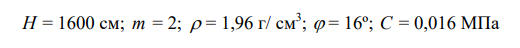 Откосы котлована глубиной H проектируются с заложением m . Грунт в состоянии природной влажности имеет следующие характеристики физикомеханических свойств: плотность грунта, угол внутреннего трения , удельное сцепление C . Определить методом кругло-цилиндрических поверхностей скольжения величину коэффициента устойчивости откоса.