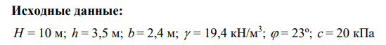 Гладкая подпорная стенка высотой H , с заглублением в грунт на величину h , шириной b испытывает давление грунта с удельным весом , углом внутреннего трения , сцеплением пылевато-глинистого грунта c . Определить величину интенсивности и построить эпюры активного и пассивного давления грунта на гладкую (угол трения грунта о стенку равен нулю) подпорную стенку по методу Кулона. Грунт за стенкой и в основании глинистый.