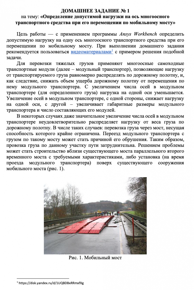 Домашнее задание №1 по теме «Определение допустимой нагрузки на ось многоосного транспортного средства при его перемещении по мобильному мосту »