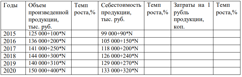 На основании приведенных данных проанализировать динамику произведенной продукции, её себестоимости, показателя затрат на один рубль произведенной продукции. Сделать выводы по результатам анализа.