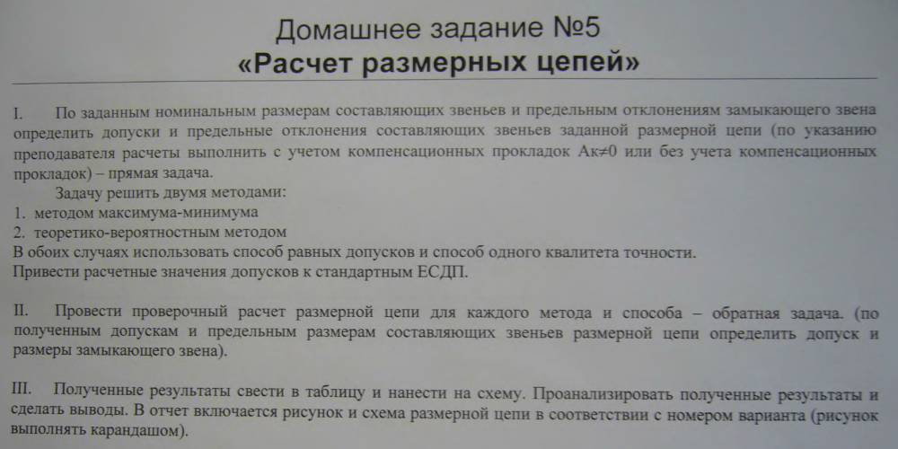 1. По заданным номинальным размерам составляющих звеньев и предельным отклонениям замыкающего звена определить допуски и предельные отклонения составляющих звеньев заданной размерной цепи (по указанию преподавателя расчеты выполнить с учетом компенсационных прокладок Ак≠0 или без учета компенсационных прокладок) - прямая задача. Задачу решить двумя методами: 1. методом максимума-минимума 2. теоретико-вероятностным методом В обоих случаях использовать способ равных допусков и способ одного квалитета точности. Привести расчетные значения допусков к стандартным ЕСДП. П. Провести проверочный расчет размерной цепи для каждого метода и способа обратная задача. (по полученным допускам и предельным размерам составляющих звеньев размерной цепи определить допуск и размеры замыкающего звена).