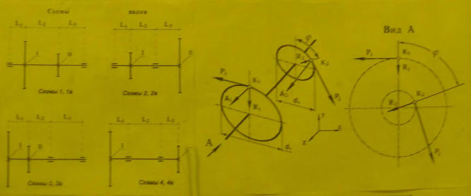 На рис.1 представлены основные схемы промежуточных валиков механических передач приборов с установленными на них зубчатыми колесами с диаметрами d и d, Каждое из колес может быть цилиндрическим прямозубым или косозубым, коническим, червячным, винтовым, что определяет наличие или отсутствие осевых сил А1 и А2.