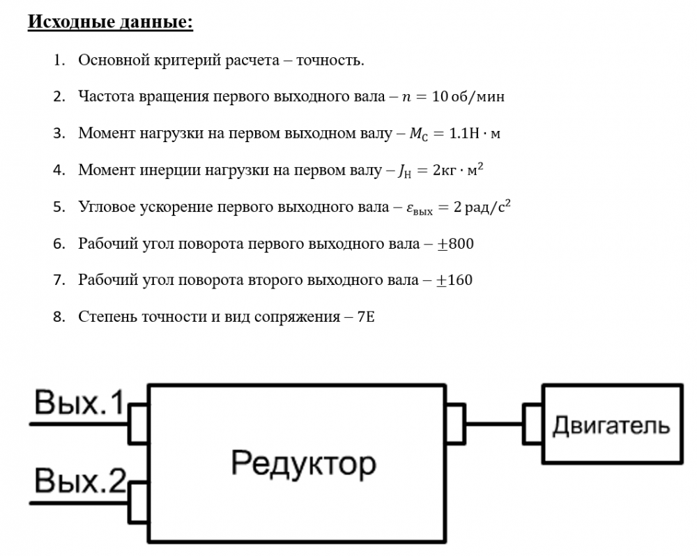 Подобрать двигатель. Выполнить кинематический расчет механизма. Составить кинематическую схему. Назначить числа зубьев и заходность червяка. Провести силовой расчет. Рассчитать передачи на прочность, предварительно выбрав материалы и установив допустимые напряжения. Определить геометрические размеры передач. Составить чертеж одного из зубчатых колес – наиболее нагруженного. Определить погрешности механизма, приведенные к выходному валу. Провести проверочный расчет быстродействия механизма..