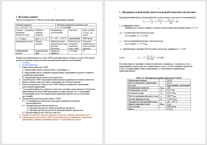 Разработать согласно заданного варианта кинематическую схему ЭМП и рабочий чертеж зубчатого колеса. Результаты расчета ЭМП представляются в виде расчетно-пояснительной записки, в которой должны содержаться следующие разделы: Исходные данные задания. Анализ исходных данных. Определение возможного значения ЭМП. Обоснование выбора электродвигателя для ЭМП. Подбор двигателя. Кинематический расчет ЭМП. 3.1. Определение общего передаточного отношения. 3.2. Определение числа ступеней и определение общего передаточного отношения по ступеням в соответствии с заданным критерием проектирования ЭМП. 3.3. Определение чисел зубьев колес редуктора. Силовой расчет ЭМП. Предварительная проверка правильности выбора электродвигателя.