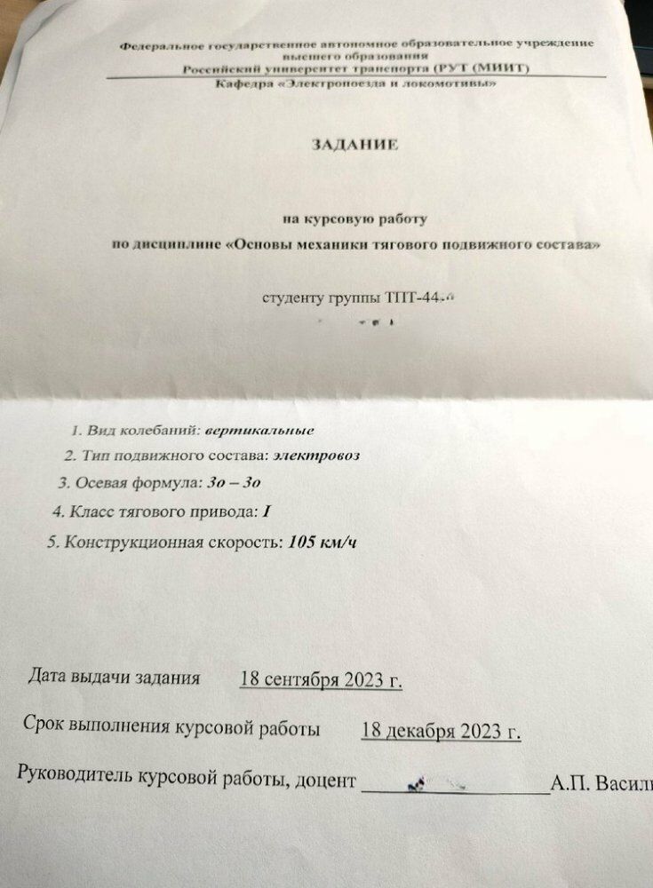 Российский университет транспорта РУТ (МИИТ) Кафедра "Электропоезда и локомотивы" Дисциплинна: Основы механики тягового подвижного состава Исследование вынужденных вертикальных колебаний и устойчивости движения заданной модели э.п.с. Вид колебанийВертикальные Тип подвижного составаэлектровоз Осевая формула30-30 Класс тягового приводаI Конструкционная скорость км/ч105 .