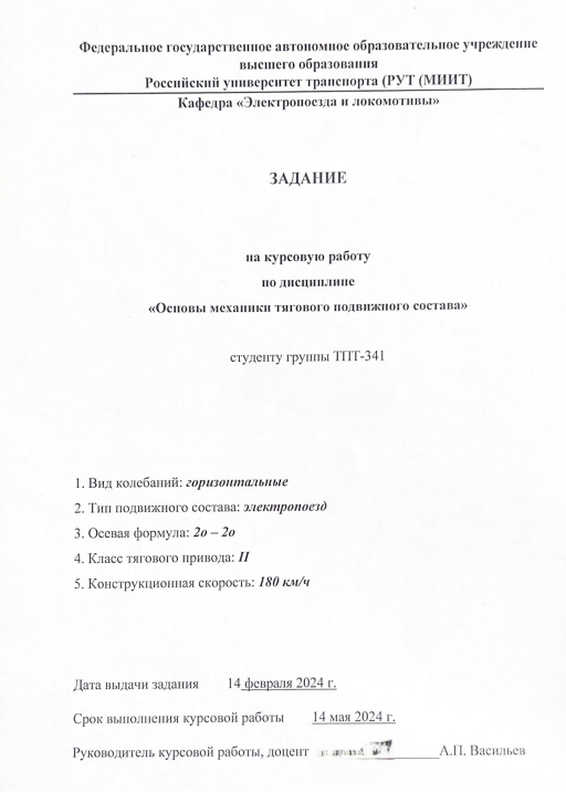 Российский университет транспорта РУТ (МИИТ) Кафедра "Электропоезда и локомотивы" Дисциплинна: Основы механики тягового подвижного состава Исследование свободных горизонтальных колебаний и устойчивости заданной модели ЭПС Вид колебанийГоризонтальные Тип подвижного составаэлектропоезд Осевая формула20-20 Класс тягового приводаII Конструкционная скорость км/ч180 .