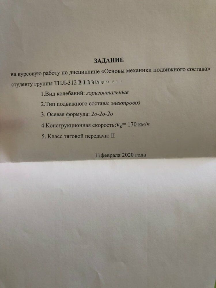 Российский университет транспорта РУТ (МИИТ) Кафедра "Электропоезда и локомотивы" Дисциплинна: Основы механики тягового подвижного состава Исследование горизонтальных колебаний одиночной тележки подвижного состава с осевой формулой 2о – 2о– 2о Цель лабораторной работы: определить критическую скорость движения одиночной тележки с осевой формулой 2о – 2о – 2о. Проверить выполнение неравенства 𝑣кр ≥ √3𝑣к . Вид колебанийГоризонтальные Тип подвижного составаэлектровоз Осевая формула20-20-20 Класс тягового приводаII Конструкционная скорость км/ч170 .
