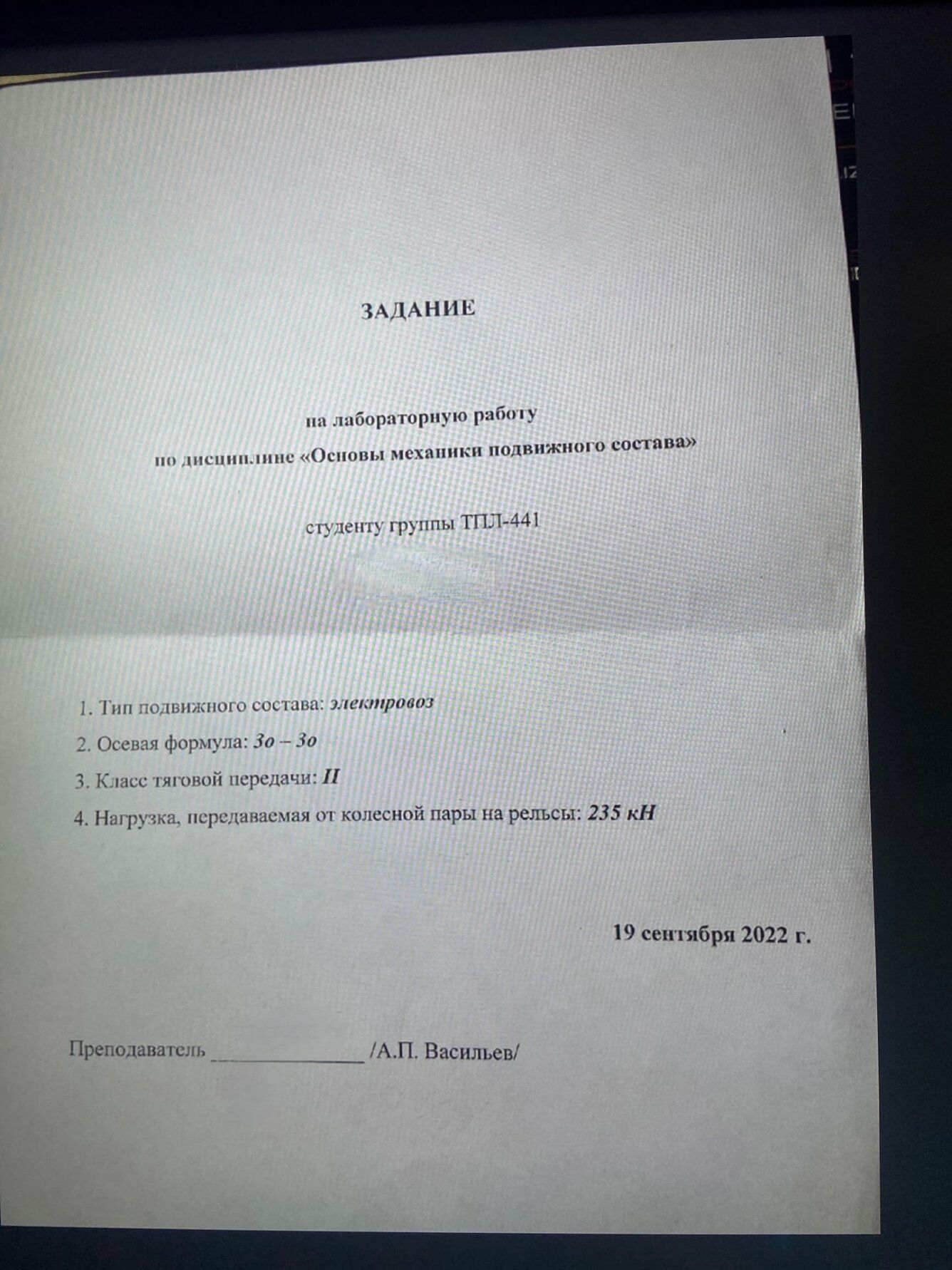 МИНИСТЕРСТВО ТРАНСПОРТА РОССИЙСКОЙ ФЕДЕРАЦИИ «РОССИЙСКИЙ УНИВЕРСИТЕТ ТРАНСПОРТА (МИИТ)» ИНСТИТУТ ТРАНСПОРТНОЙ ТЕХНИКИ И СИСТЕМ УПРАВЛЕНИЯ Кафедра «Электропоезда и локомотивы» ЛАБОРАТОРНАЯ РАБОТА ПО ДИСЦИПЛИНЕ ОСНОВЫ МЕХАНИКИ ПОДВИЖНОГО СОСТАВА РАСЧЕТ РАМЫ ТЕЛЕЖКИ НА ПРОЧНОСТЬ ПРИ ДЕЙСТВИИ ВЕРТИКАЛЬНОЙ СТАТИЧЕСКОЙ НАГРУЗКИ Вид колебанийВертикальный Тип подвижного составаэлектровоз Осевая формула30-30 Класс тягового приводаII Нагрузка передаваемая колесной парой235кН .