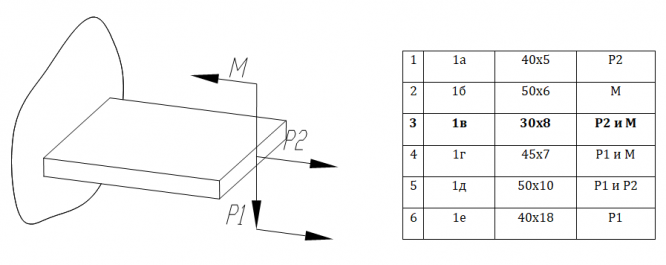 Указать месторасположение тензорезисторов на упругом элементе и схему их соединения для измерения сил и момента указанных на рисунке и определить напряжение на выходе моста, если сжатие пластины, имеющих сечение (F) мм и нагружена силой Р=3000Н или (моментом М=2 0Н*м)