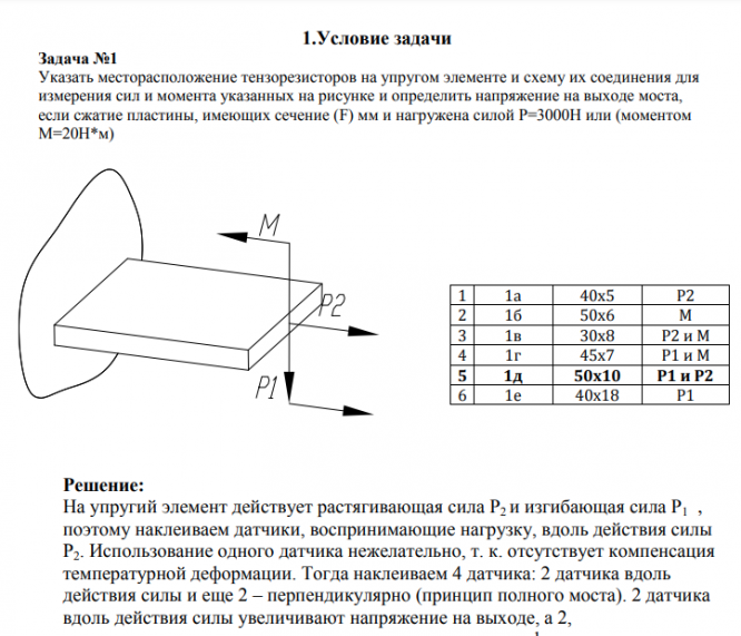 Задача №1 Указать месторасположение тензорезисторов на упругом элементе и схему их соединения для измерения сил и момента указанных на рисунке и определить напряжение на выходе моста, если сжатие пластины, имеющих сечение (F) мм и нагружена силой Р=3000Н или (моментом М=20Н*м)