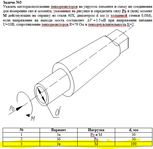 Указать месторасположение тензорезисторов на упругом элементе и схему их соединения для измерения сил и момента, указанных на рисунке и определить силу Ро и (или) момент М действующих на оправку из стали 40Х, диаметром d мм (с толшиной стенки 0,08d), если напряжение на выходе моста составляет 1.5 мВ при напряжении питания U=10В, сопротивление тензорезисторов R=79 Ом и тензорчувсвительность К=2.