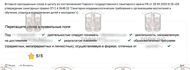 Вставьте пропущенные слова в цитату из постановления Главного государственного санитарного врача РФ от 28.09.2020 N 28 «Об утверждении санитарных правил СП 2.4.3648-20 \"Санитарно-эпидемиологические требования к организациям воспитания и обучения, отдыха и оздоровления детей и молодежи\"»). Под ___ деятельностью следует понимать ___деятельность, направленную на достижение ___ результатов освоения ___ образовательных программ (предметных, метапредметных и личностных), осуществляемую в формах, отличных от ___ .