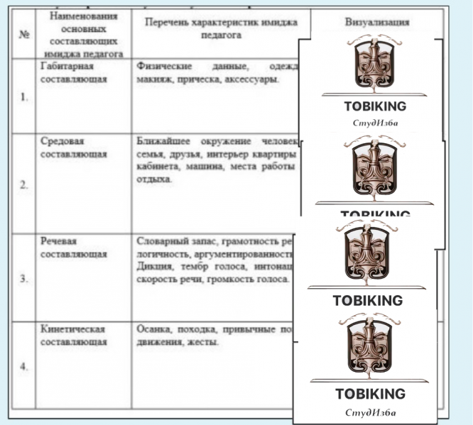 Установите соответствие между наименованиями основных составляющих, перечнем и визуализацией характеристик имиджа педагога. Для этого переместите предложенное фотографическое изображение с портретом педагогического работника в соответствующую ячейку таблицы, используйте при этом левую кнопку компьютерной мыши.