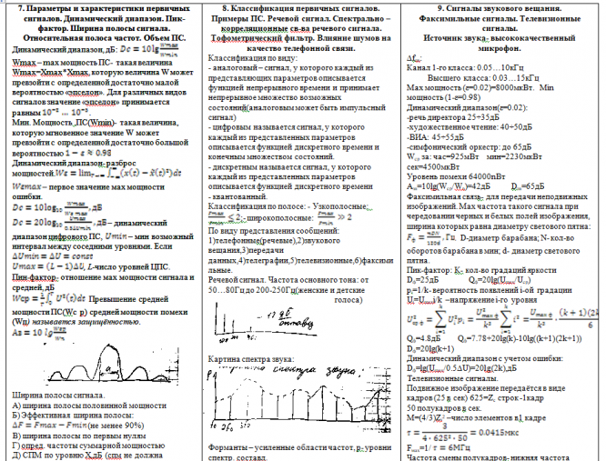 7. Параметры и характеристики первичных сигналов. Динамический диапазон. Пик-фактор. Ширина полосы сигнала. Относительная полоса частот. Объем ПС.