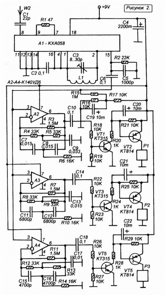 Сделать библиотеку компонентов (УГО и посадочные места) для принципиальной электрической схемы "Системы для усовершенствованной аналоговой системы радиоуправления - Схема приемника и декодера команд" на рисунке. Также собрать такую же схему в P-CAD,выполнить прямую и ортогональную трассировки ручным и автоматическим способами