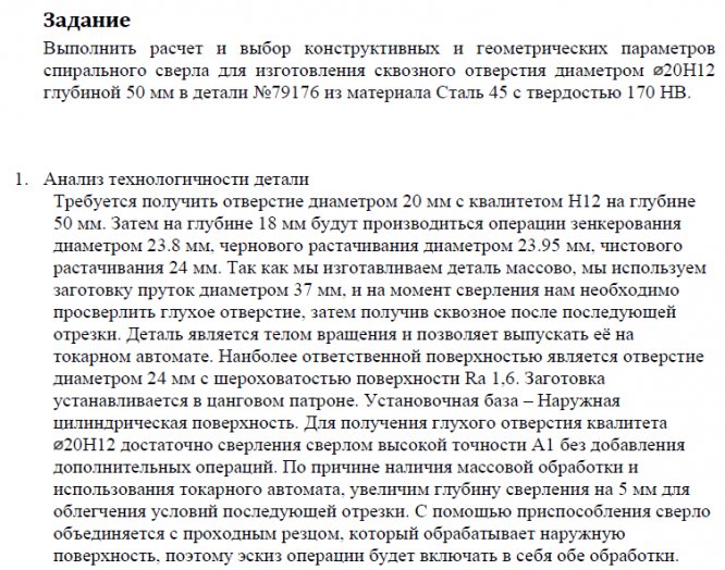 Для студентов МГТУ им. Н.Э.Баумана по предмету Основы проектирования режущего инструмента (ОПРИ)Домашнее задание №1 "Расчет конструктивных и геометрических параметров спирального сверла" (деталь №79176 Сталь 45, твердость 170 НВ)Домашнее задание №1 "Расчет конструктивных и геометрических параметров спирального сверла" (деталь №79176 Сталь 45, твердость 170 НВ)