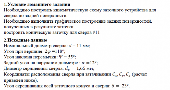 Главная » Учебные материалы » Основы проектирования режущего инструмента (ОПРИ) » Домашние задания » МГТУ им. Н.Э.Баумана » 8 семестр » Домашнее задание №2 "Анализ изменения заднего угла сверла" (диаметр сверла 11 мм)