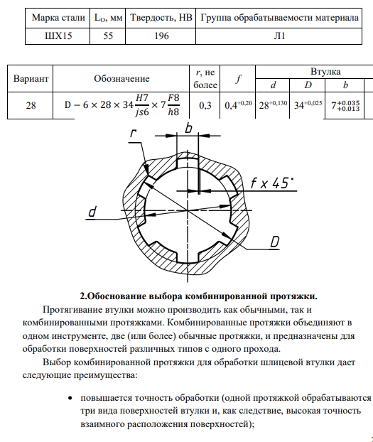 Исходные данные к расчёту протяжки.Выполнить расчет геометрических и конструктивных параметров комбинированной протяжки для изготовления шлицевой втулки (отверстия) размером 55 заготовки из стали ШХ15 твердостью 196 НВ.