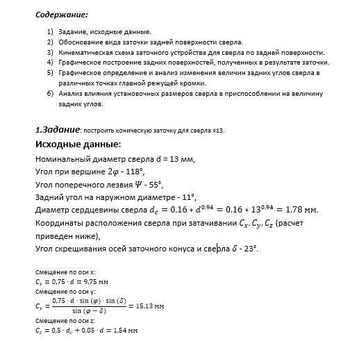 Для студентов МГТУ им. Н.Э.Баумана по предмету Основы проектирования режущего инструмента (ОПРИ)Расчет конструктивных и геометрических параметров спирального сверла; Графическое построение конической заточки (отверстие Ø13 мм. длиной 133 мм., матРасчет конструктивных и геометрических параметров спирального сверла; Графическое построение конической заточки (отверстие Ø13 мм. длиной 133 мм., мат