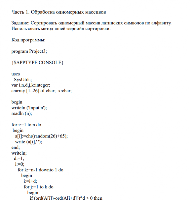 Часть 1. Обработка одномерных массивов Задание: Сортировать одномерный массив латинских символов по алфавиту. Использовать метод «шей-керной» сортировки. Код программы: program Project3; {$APPTYPE CONSOLE}