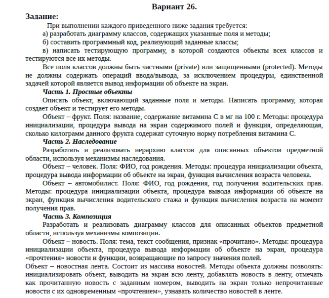 Главная » Учебные материалы » Основы программирования » Домашние задания » МГТУ им. Н.Э.Баумана » 1 семестр » Домашнее задание №3 "Простые объекты. Наследование. Композиция" (вариант №26)
