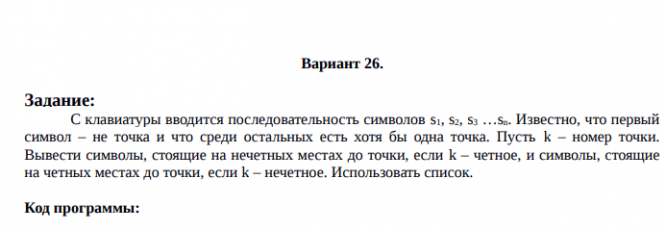 Задание: С клавиатуры вводится последовательность символов s1, s2, s3 …sn. Известно, что первый символ – не точка и что среди остальных есть хотя бы одна точка. Пусть k – номер точки. Вывести символы, стоящие на нечетных местах до точки, если k – четное, и символы, стоящие на четных местах до точки, если k – нечетное. Использовать список.