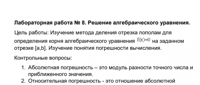 Главная » Учебные материалы » Основы программирования » Лабораторные работы » МГТУ им. Н.Э.Баумана » 1 семестр » Номер 8 » Вариант 2 » Лабораторная работа № 8 (Решение алгебраического уравнения)
