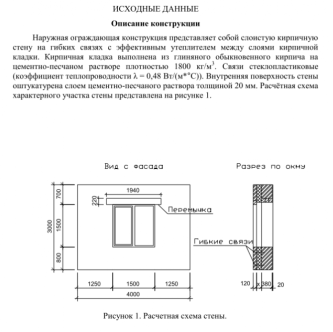 Наружная ограждающая конструкция представляет собой слоистую кирпичную стену на гибких связях с эффективным утеплителем между слоями кирпичной кладки. Кирпичная кладка выполнена из глиняного обыкновенного кирпича на цементно-песчаном растворе плотностью 1800 кг/м2. Связи стеклопластиковые (коэффициент теплопроводности λ = 0,48 Вт/(м*°C)). Внутренняя поверхность стены оштукатурена слоем цементно-песчаного раствора толщиной 20 мм. Расчётная схема характерного участка стены представлена на рисунке I.