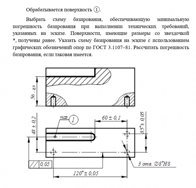 Выбрать схему базирования, обеспечи­вающую минимальную погрешность базирования при выполнении технических требований, указанных на эскизе. Поверхности, имеющие размеры со звездочкой *, получены ранее. Указать схему базирова­ния на эскизе с использованием графических обозначений опор по ГОСТ 3.1107–81. Рассчитать погрешность базирования, если таковая имеется.