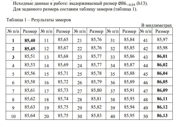 Задание: исследовать точность размера после обработки поверхности (кривая Гаусса) и определить процент брака. Исходные данные к работе: выдерживаемый размер ∅86−0,54 (h13).