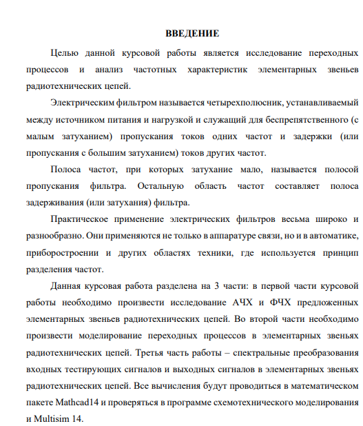 Целью данной курсовой работы является исследование переходных процессов и анализ частотных характеристик элементарных звеньев радиотехнических цепей. Электрическим фильтром называется четырехполюсник, устанавливаемый между источником питания и нагрузкой и служащий для беспрепятственного (с малым затуханием) пропускания токов одних частот и задержки (или пропускания с большим затуханием) токов других частот. Полоса частот, при которых затухание мало, называется полосой пропускания фильтра. Остальную область частот составляет полоса задерживания (или затухания) фильтра.