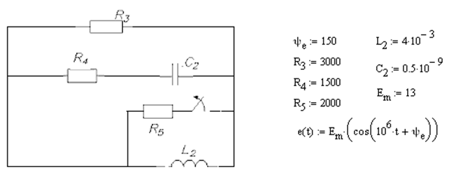 Задание- Найти переходный ток на входе цепи второго порядка, изображенной на схеме, и построить график его изменения в функции времени. ЭДС источника задана в виде: e(t)=Emcos(106t+Ye)