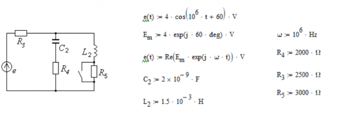 Задание- Найти переходный ток на входе цепи второго порядка, изображенной на схеме, и построить график его изменения в функции времени. ЭДС источника задана в виде: e(t)=Emcos(106t+Ye)