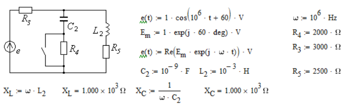 Задание- Найти переходный ток на входе цепи второго порядка, изображенной на схеме, и построить график его изменения в функции времени. ЭДС источника задана в виде: e(t)=Emcos(106t+Ye)