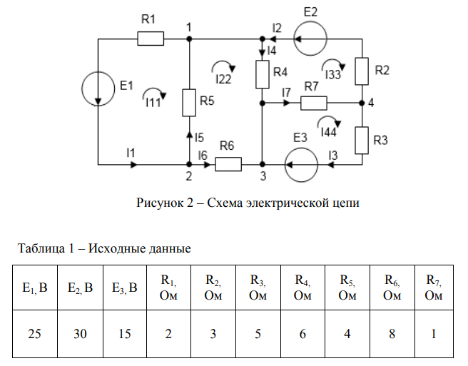 1. Расчет электрических цепей при постоянном воздействии Начертить схему электрической цепи с обозначением узлов и элементов ветвей. Для заданной схемы составить и решить уравнения по законам Кирхгофа, методом контурных токов и методом узловых потенциалов для определения токов в ветвях. Составить баланс мощностей. Определить ток I1 методом эквивалентного генератора. Построить потенциальную диаграмму для любого замкнутого контура, включающего обе э.д.с.