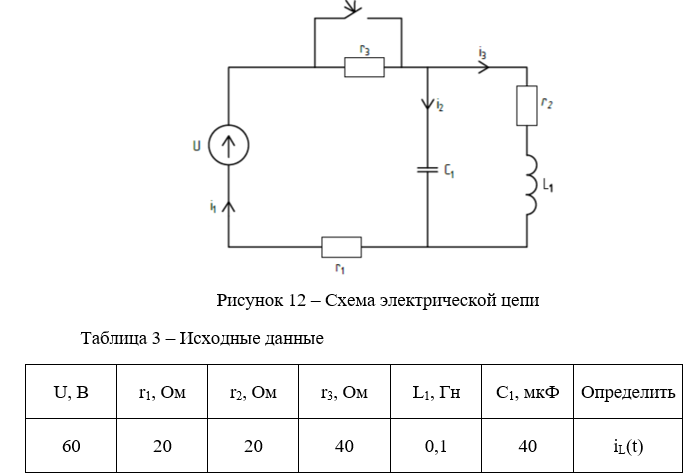 Задана электрическая схема (см. рисунок 12). Исходные данные для схемы приведены в таблице 3. В цепи действует постоянная ЭДС Е. Рассчитать переходный процесс в цепи и определить закон изменения во времени тока в ветви с индуктивностью или напряжение на емкости. Построить графики iL(t) или uC(t).