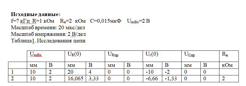 - Подключить параллельно конденсатору С резистор Rн (второй магазин сопротивлений), имитирующий нагрузку интегрирующей цепи (Rн=2R). Зарисовать с экрана осциллографа кривые переходных напряжений uR u uc. Измерить и занести в таблицу 1 начальные (при t=0) и принужденные значения этих напряжений. На основании данных таблицы и п.5 записать выражения для i(t) и uc(t). Сделать заключение о влиянии нагрузки на форму выходного импульса интегрирующей цепи.