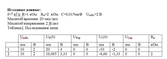 - Зарисовать с осциллографа кривые входного импульса и переходных напряжений на конденсаторе и резисторе. Измерить начальные (при t=0) и установившиеся значения снятых напряжений и занести данные опыта в таблицу.
